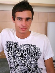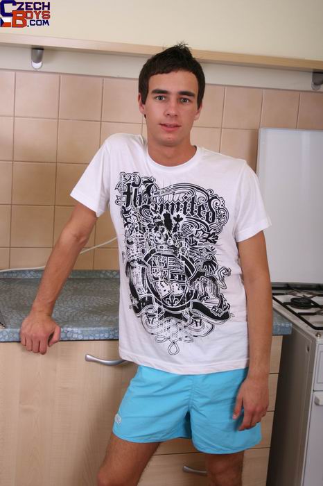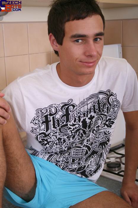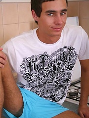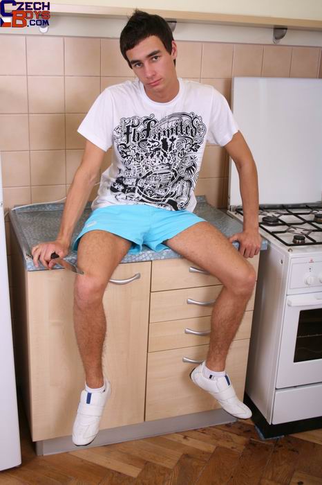 Horny Euro twink gets on the kitchen counter and strokes his dick