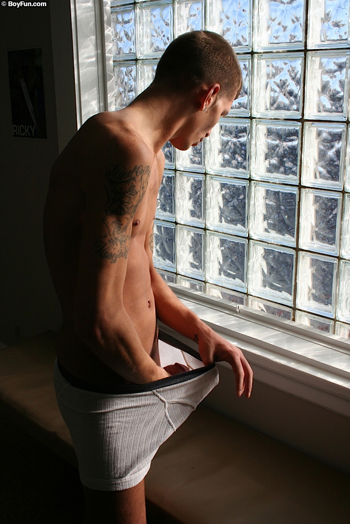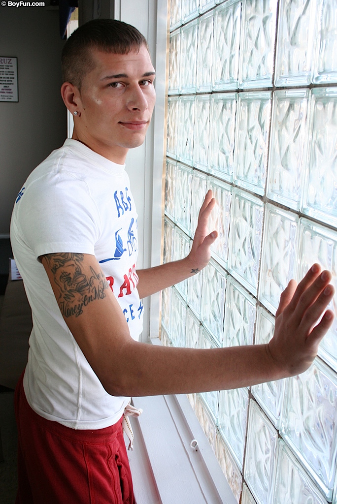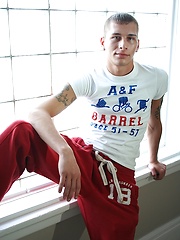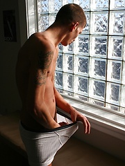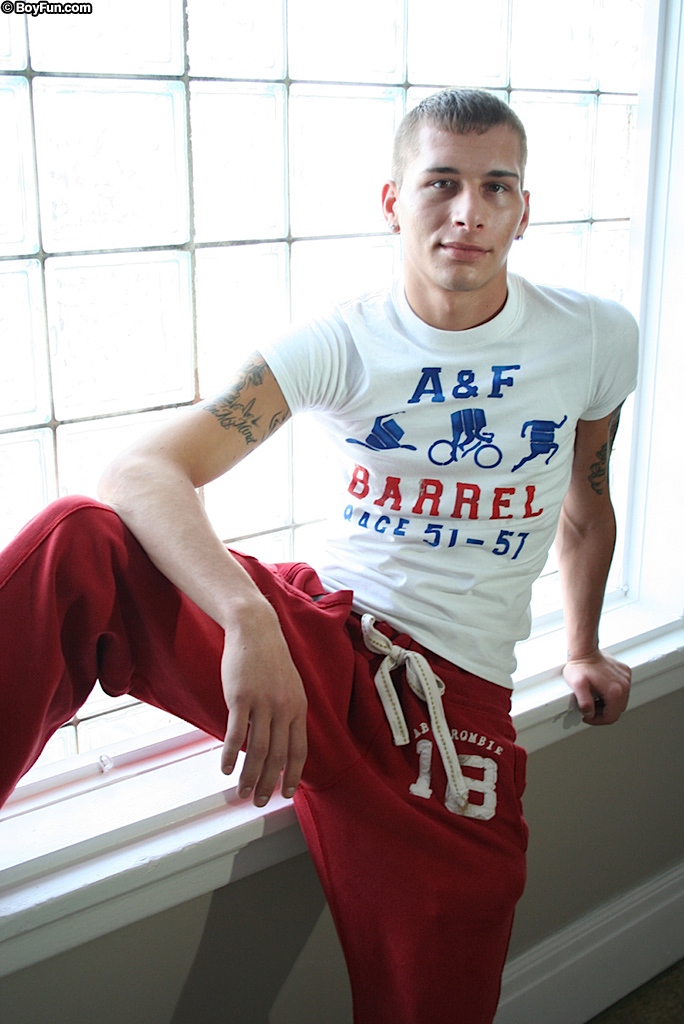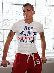 Athletic boy Eric strokes his thick hard cock.
